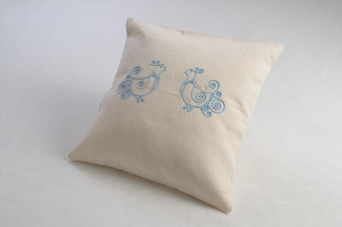 Cuscino in cotone liscio 100% colore ecrù  con disegno pavoncelle celestino n°4 lavorazione a cordonetto – misura 40×40.