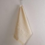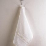 Canovaccio da cucina in misto lino 80% di lino e 20% di cotone tessuto liscio bianco con disegno esagoni e fiorellini in bianco, lavorazione a “pibiones” con orlo a giorno sotto e sopra realizzato a mano – Misura 69×47.
