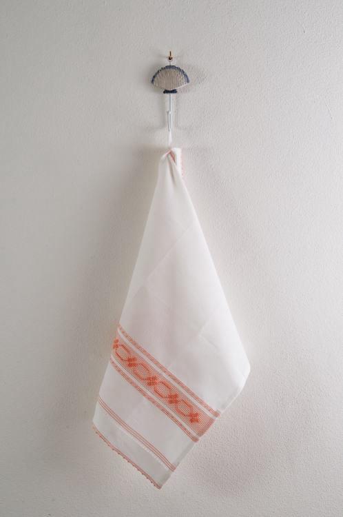 Canovaccio da cucina in misto lino 80% di lino e 20% di cotone tessuto liscio bianco con disegno esagoni e fiorellini colore salmone n°8, lavorazione a “pibiones” con orlo a giorno sotto e sopra realizzato a mano. Misura 69×47.