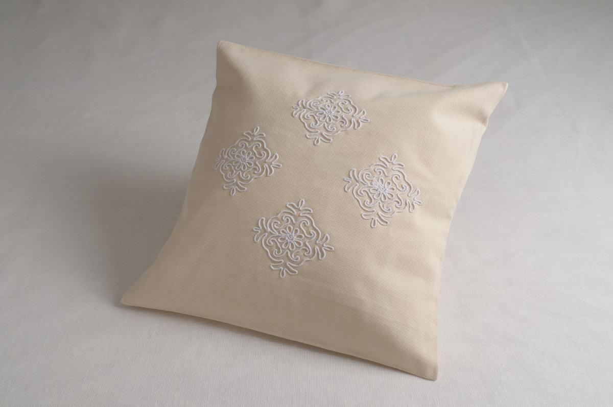 Cuscino in cotone liscio 100% colore ecru’ con disegno “pistoccu” (biscotti che le nostre nonne realizzavano in periodo di festa interamente realizzati a mano)colore  bianco lavorazione a cordonetto  – misura 40×40.