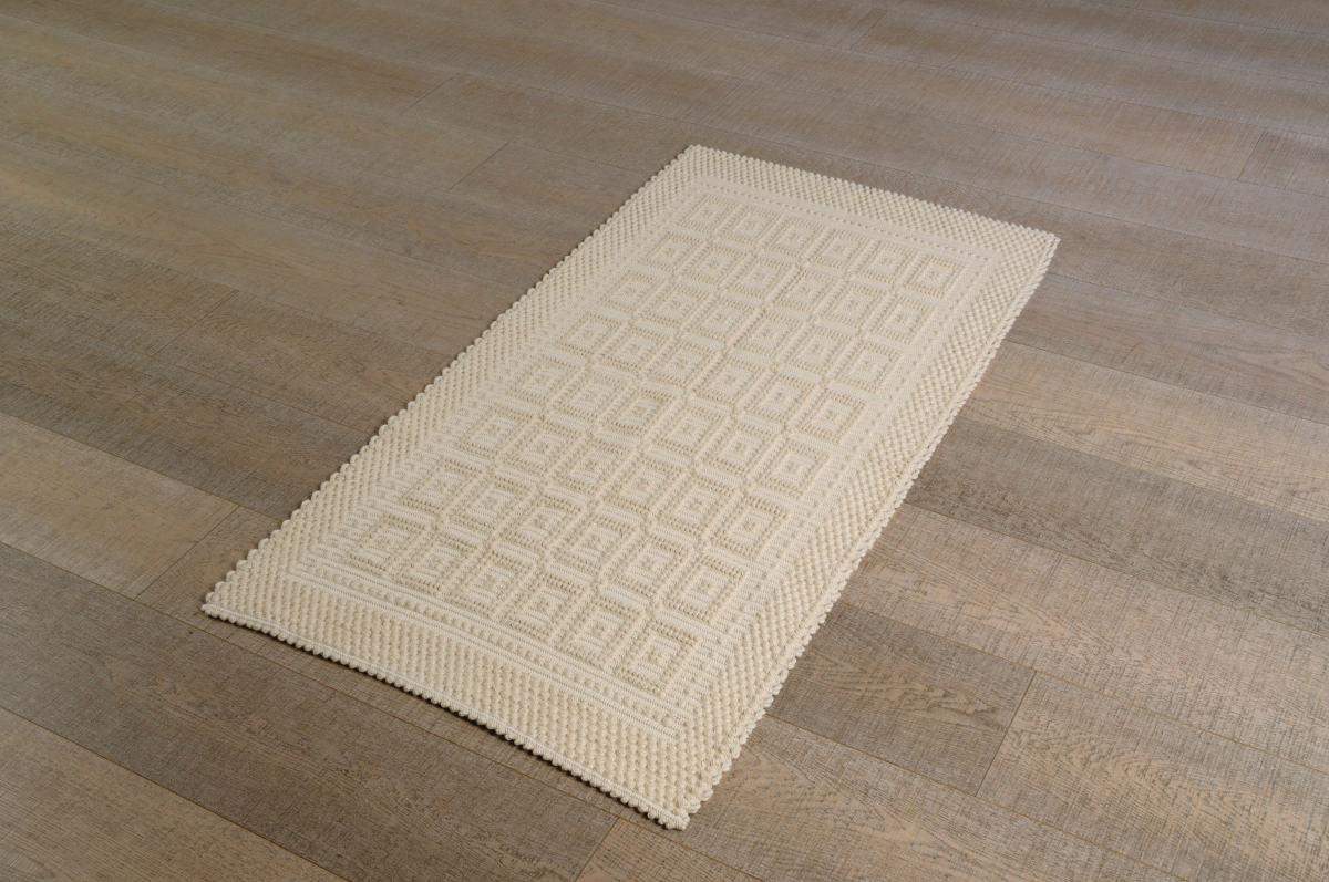 Tappeto in cotone al 100%, tessuto a rilievo con lavorazione a “pibiones”, disegno quadretti.