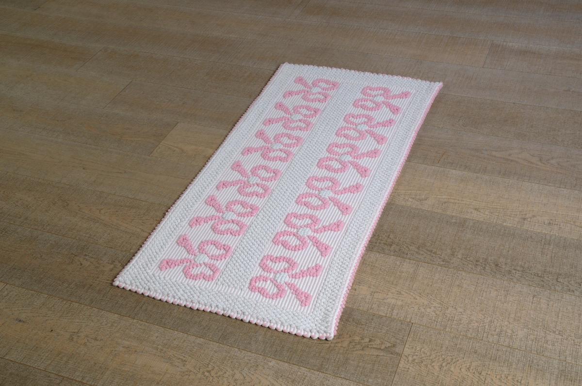 Tappeto in cotone al 100%, tessuto a rilievo con lavorazione a “pibiones” disegno fiocchi.