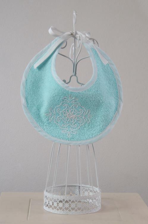 Bavaglino neonato/a in spugna al 100%, verde acqua, con “pistoccu” (disegno tipico sardo) bianco, lavorazione a cordonetto.