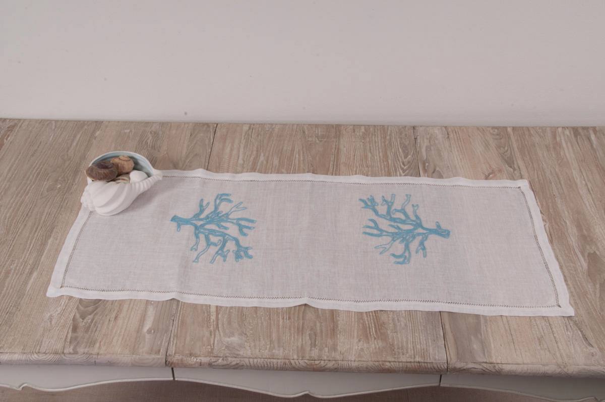 Centro rettangolare in lino puro al 100%, colore bianco, con disegno corallo colore celeste, lavorazione a cordonetto, rifinito tutto intorno con orlo a giorno doppio (traforo) a zig zag, realizzato interamente a mano.