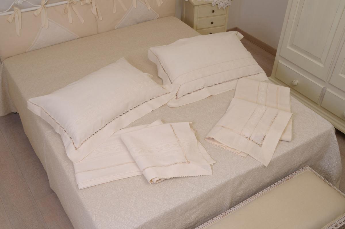 Lenzuolo in misto lino 80% lino e 20% cotone, composto dal lenzuolo di sopra e n°2 federe, (il lenzuolo di sotto si puo’ avere a parte) colore panna, disegno roselline, lavorazione a “pibiones”, con gigliuccio (traforo) nei tre lati del lenzuolo e delle federe, realizzato esclusivamente a mano.