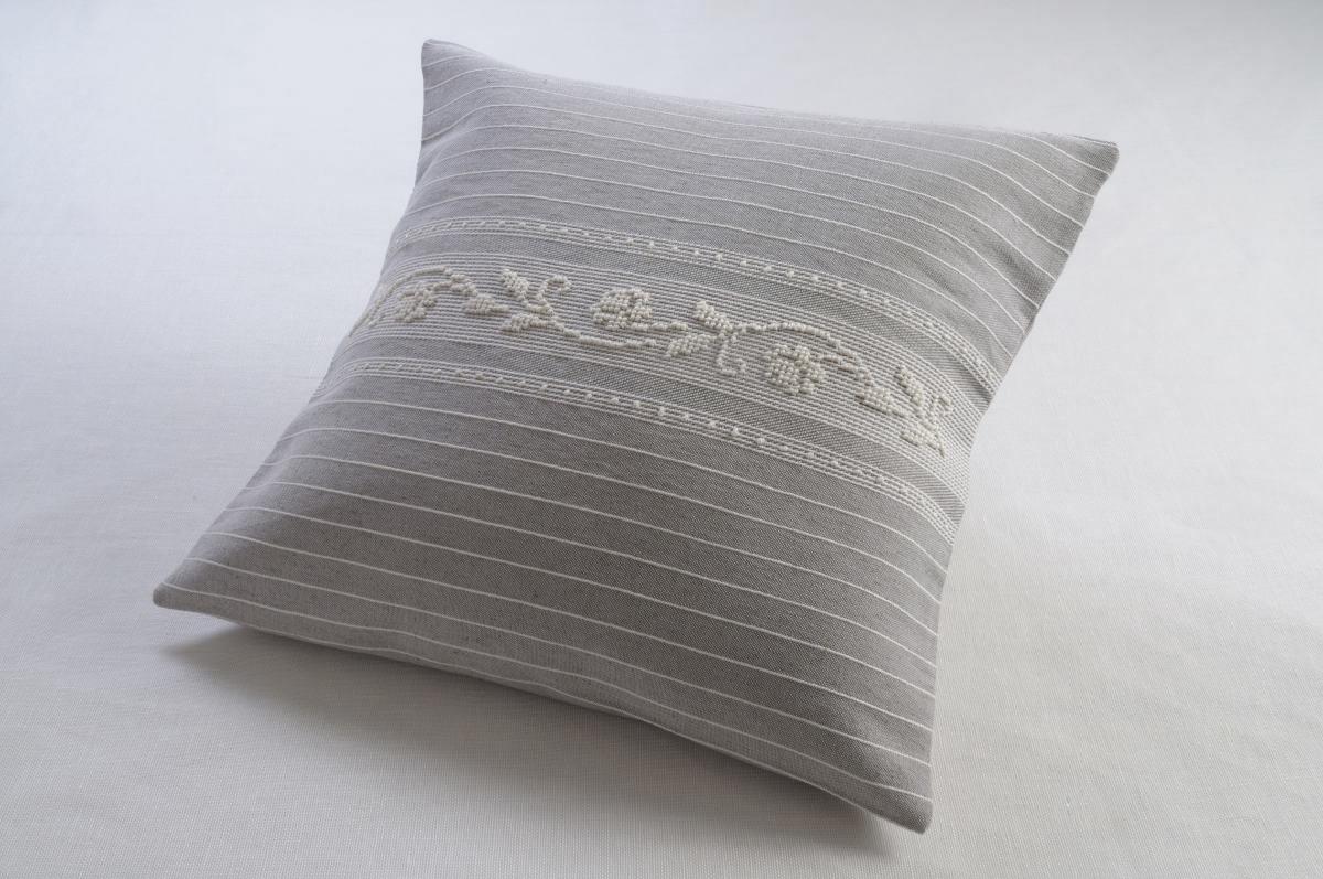 Cuscino in misto lino 80%lino e 20% cotone lavorazione a “pibiones” –  tessuto rigato colore tortora con disegno roselline colore ecrù  – misura 50×50.