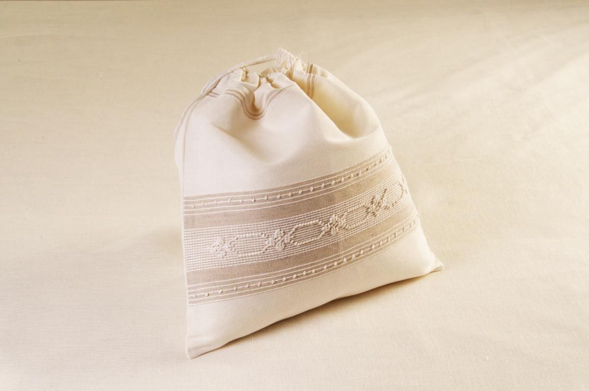 Sacchetto in misto lino 80% di lino e 20% di cotone colore bianco con disegno esagoni e fiorellini colore bianco con sotto trama tortora, lavorazione a pibiones, con chiusura con cordoncino in cotone – misura 37×39.